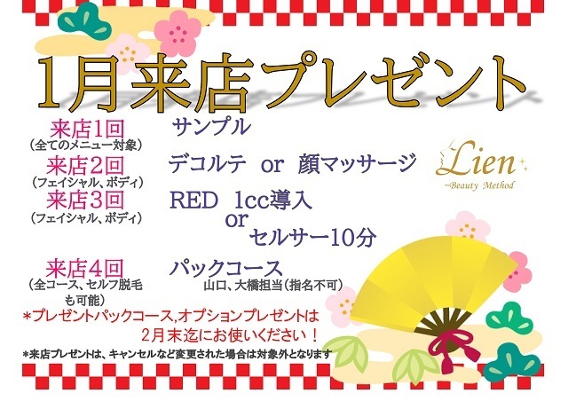 1月来店プレゼントは事前予約ではなく1月にご予約頂きご来店で対象です
