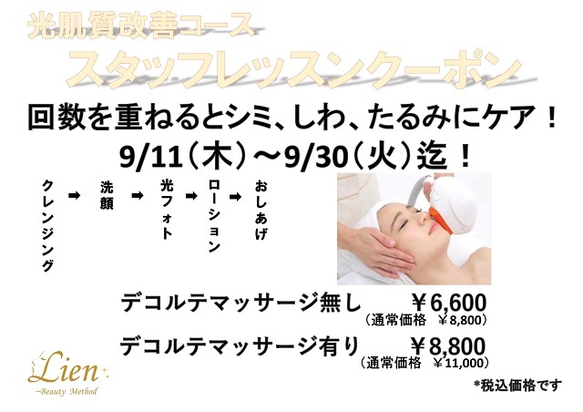 そして9月は光肌質改善(光フォト)のコースのレッスンモデルを募集します