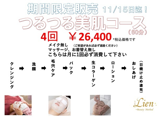 但し、こちらのメニューは期間限定販売と通常のパックのみのコースよりお安いのと、お肌には月に2回くらいしていただきたいメニューです