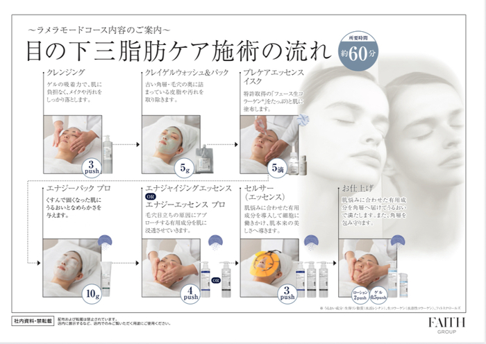 クレンジング~洗顔後~毛穴のお掃除~パック~生コラーゲン(プレケア)~ローション塗布(デコルテマサージ追加の場合はローションパック)~お仕上げ